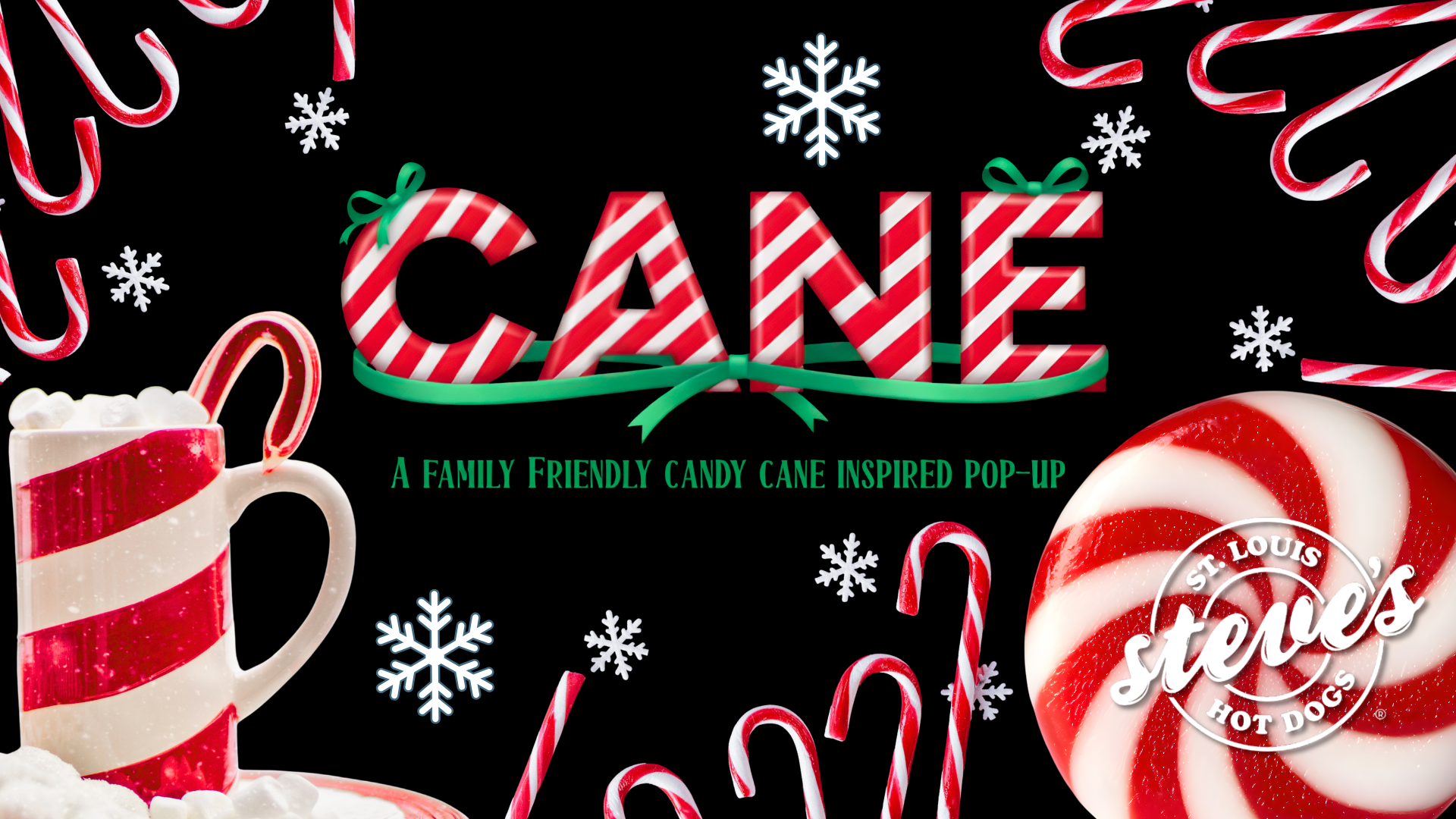 CANE, our candy-cane-themed pop-up at Steve’s Hot Dogs, is all about having fun, spreading cheer, and giving back to the community that shows up for us year after year. A portion of every ticket sold supports Dollar$ for Delmar, helping local small businesses rebuild after the May 16 tornado.